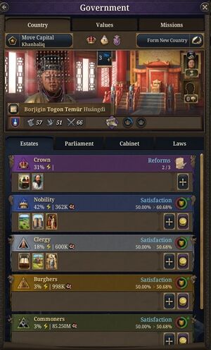 - Отображаются доля власти каждого сословия, численность подконтрольного населения, удовлетворённость и сила короны. В стартовом примере за Московское княжество велика доля бояр и общин при слабой короне.